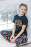 Костюм для подростков с композицией "Забавные вишенки". Футболка свободного кроя, укороченная, со спущенным плечом. Брюки длинные, свободные на широком поясе с карманами. Рекомендуется деликатная стирка