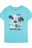 Футболка для мальчика прямого силуэта с втачным коротким рукавом. Горловина круглая, обработана воротником из рибаны. Горловина спинки внутри укреплена бейкой из кулирки. Низ изделия и рукава обработан швом вподгибку. На полочке Фотопринт с шелкографией. Надпись переводится как "Наслаждайся каждым моментом; Самый простой способ сохранять спокойствие-лежать под пальмой; Волны позитива".