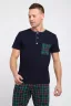 Мужской пижамный костюм футболка с брюками. Брюки полной длины слегка заужены к низу, с вместительными карманами по бокам. Футболка с коротким рукавом модель поло с пуговицами, на груди накладной кармашек.