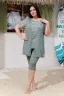 Костюм женский "тройка": Футболка, жилет, бриджи. Футболка с округлым вырезом, короткими рукавами и разрезами в боковых швах. Жилет прямого силуэта. Полочка и спинка из двух частей: верхней и нижней. Застежка на одну декоративную кокосовую пуговицу на уровне линии талии. Бриджи облегающие из х/б ткани с лайкрой.