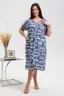 Халат с застежкой на молнию, полуприлегающего силуэта, длиной ниже колена, с V-образной горловиной, с накладными боковыми карманами. Рукав спущенный, короткий. В верхней части полочки расположены кокетки. Спинка с кокеткой. В нижней части боковых швов обработаны разрезы. Горловина, проймы и верх карманов обработаны бейкой из отделочного полотна с белым кантом и декоративной строчкой.