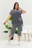 Костюм женский, туника и бриджи. Туника расширенная к низу с боковыми разрезами, низ фиксируется завязками. Горловина Y-образная, рукав короткий цельнокроенный, около плечевого шва небольшая сборка. Кокетка полочки и спинки из двух частей в полоску, соединяющихся под наклоном. На полочке накладной фигурный карман. Бриджи прямого силуэта, внизу брюк разрезы и утяжки. На передних частях внутренние карманы и боковые с бантовой складкой. Пояс выполнен на многоигольной машине.