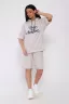 Костюм с шортами из кулирки с лайкрой. Кофта свободная с капюшоном с люверсами и шнурком. По переду принт ,рукав короткий на манжете, длинна до бедра .Шорты свободного покроя с карманами, длина до колена. На модели размер 48-50.Шнурки от партии могут отличаться. Размеры сдвоены.