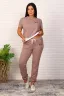 Костюм женский трикотажный - футболка и брюки. Футболка укороченная с отделкой по низу контрастного цвета. Брюки с завязками и втачными боковыми карманами. На футболке и брюки небольшие отделочные печати.
