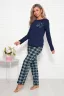 Комфортная и стильная женская пижама. Брюки в клетку с двумя боковыми карманами, на эластичном поясе и футболка с длинным рукавом, с печатью на полочке.