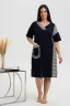 Платье прямого силуэта, с V-образной горловиной спереди, с разрезами в нижней части боковых швов. На полочке расположен фигурный двойной накладной карман. Рукав короткий. Горловина полочки обработана обтачками. Горловина спинки обработаны бейкой из основного полотна.
