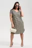 Платье прямого силуэта, с V-образной горловиной, с фигурной линией низа, с удлиненной спинкой, с карманами в боковых швах. Рукав цельнокроеный, короткий. Горловина и проймы обработаны бейкой из основного полотна.