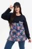 Туника женская прямого силуэта, горловина округлая. На верхней части полочки и спинки по два рельефа. Рукав цельнокроеный со швом. Верхняя часть туники, рукава из однотонной ткани, нижняя часть из набивного футера "цветы". На полочке нагрудный карман с декоративной тесьмой. В боковых швах разрезы.